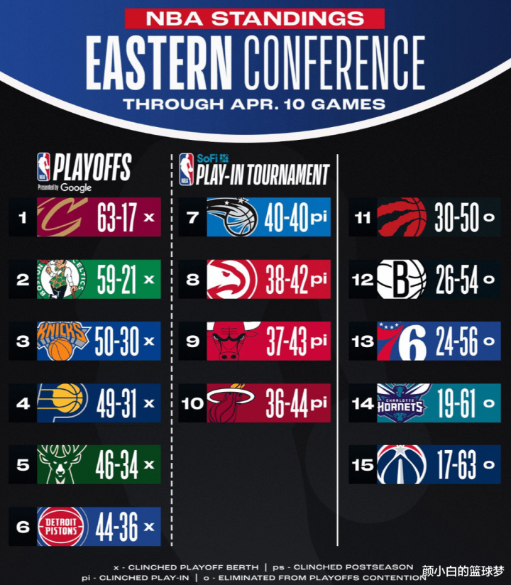 跟西部的大乱斗比起来,东部明显要“冷清”的多,因为骑士、凯尔特人、尼克斯、步行者已经锁定了前四,骑士、凯尔特人、尼克斯、步行者、雄鹿、活塞已经锁定前六,附加赛的四队已经确定是魔术、老鹰、公牛、热火。